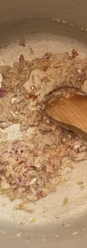 Ajouter le riz et brasser jusqu’à ce qu’il devienne transparent.